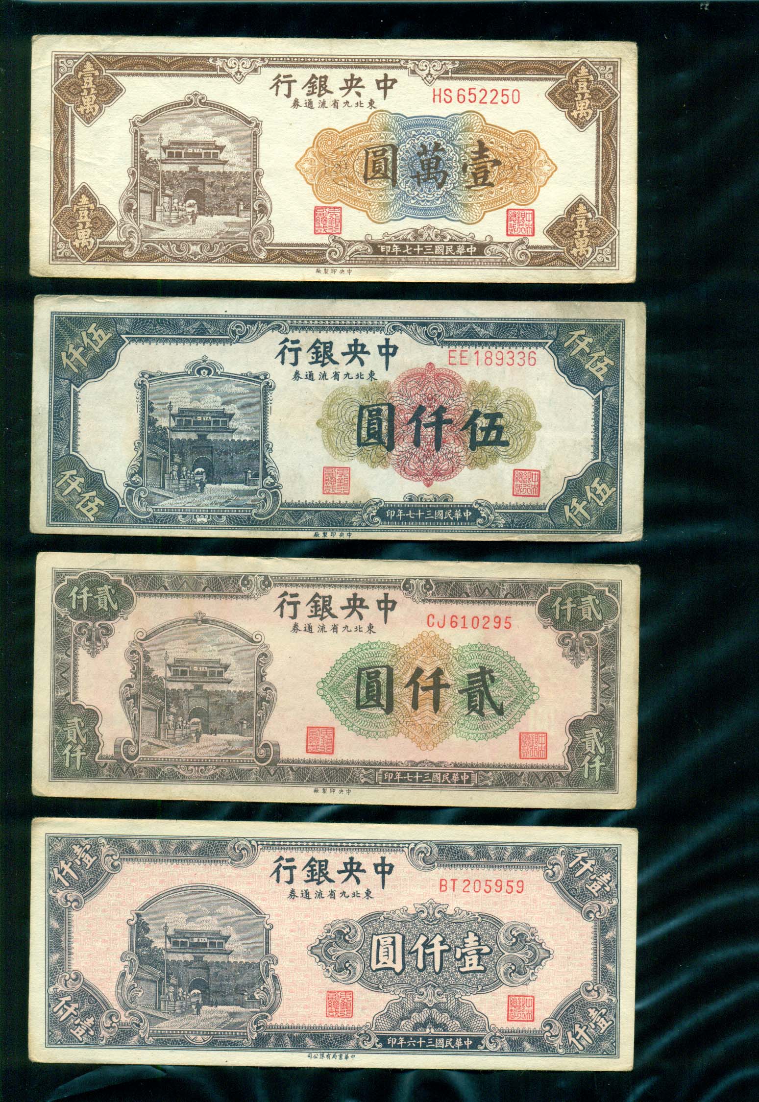 中央銀行 10000,5000,2000,1000원권 中華民國三十六~七年 4장