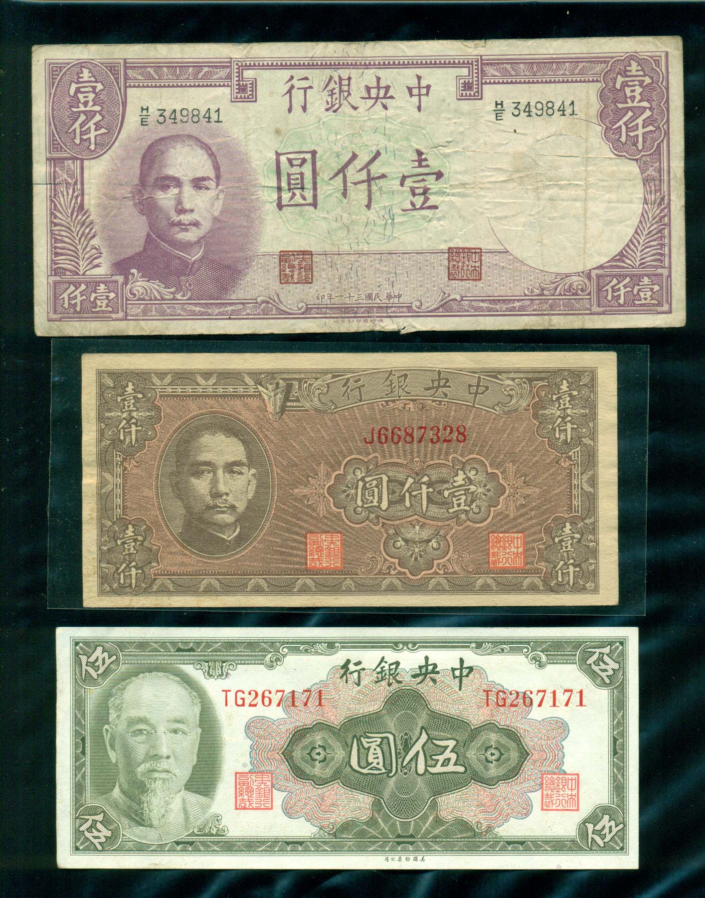 中央銀行 1000,1000,5원권 中華民國三十一~四年 3장