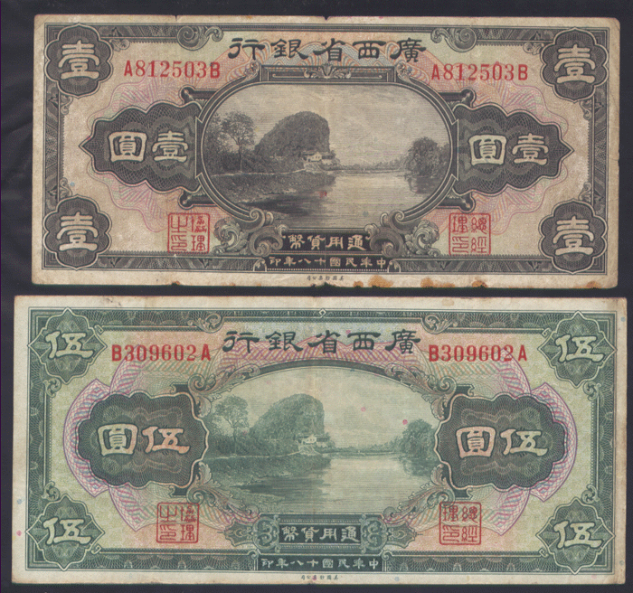 중국 광서성은행 1원 5원권 2장(1929년)