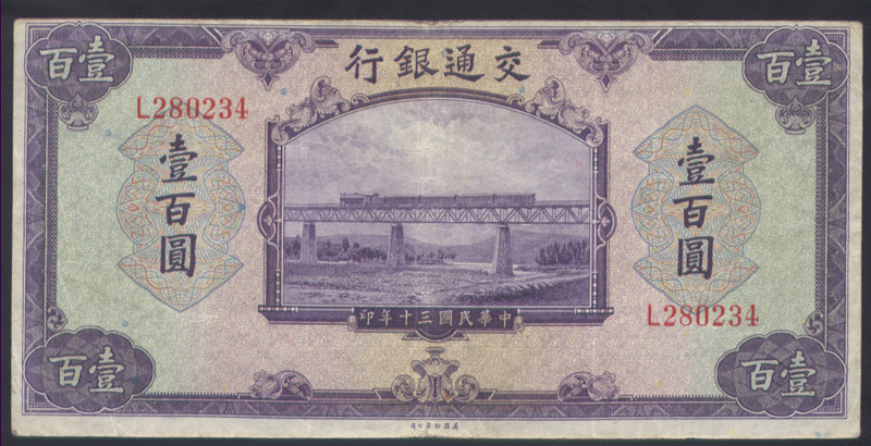 중국 교통은행 100원권 1941년