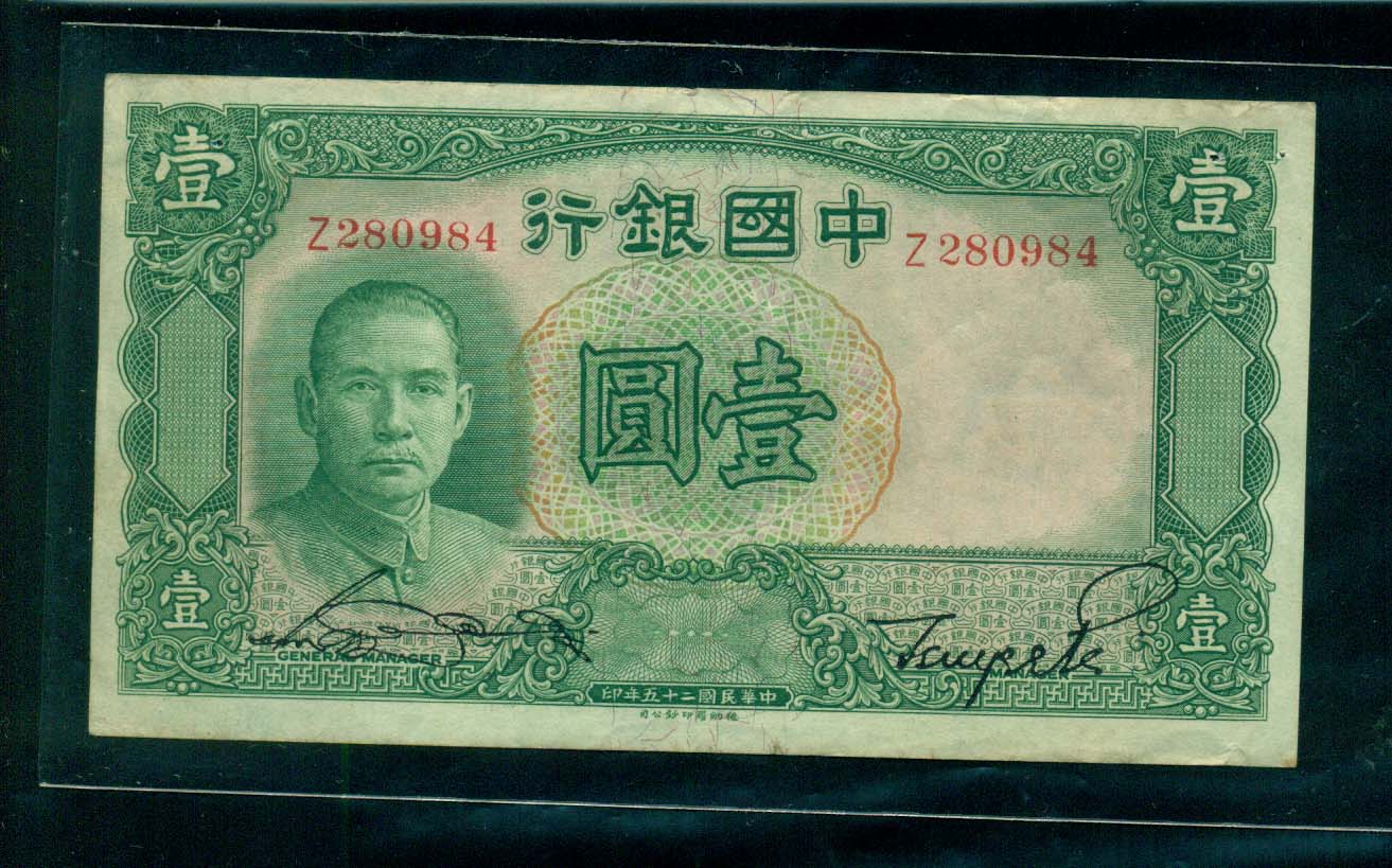中國銀行 1원권 中華民國 二十五年 1936 準未使用品