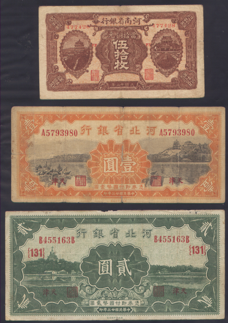 중국 하남성은행 伍拾枚,1원,2원권 3종 (1934년)